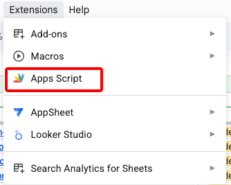 In your Google Sheet, go to Extensions → Apps Script and paste the following script: